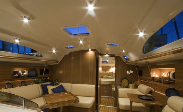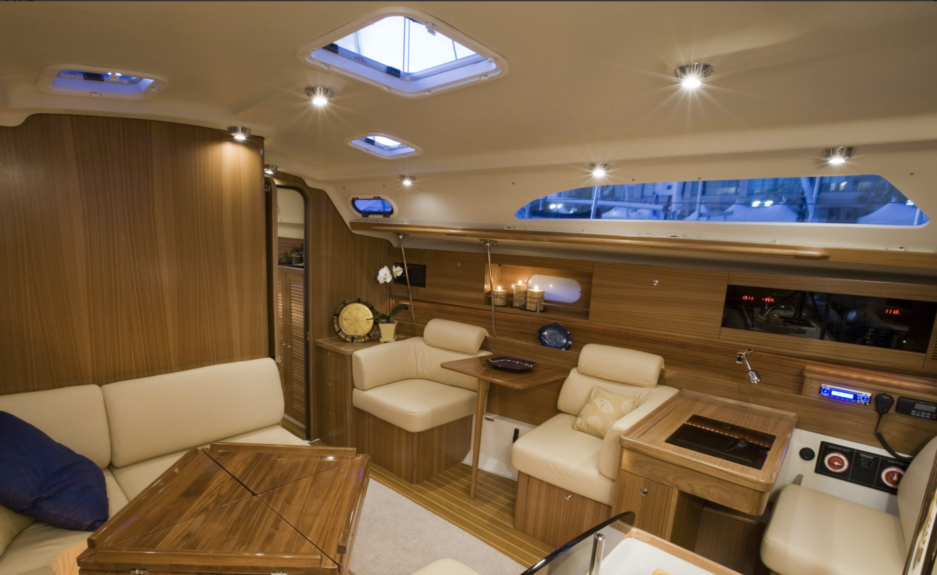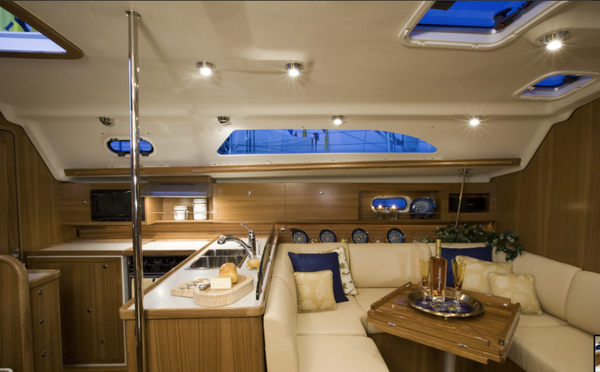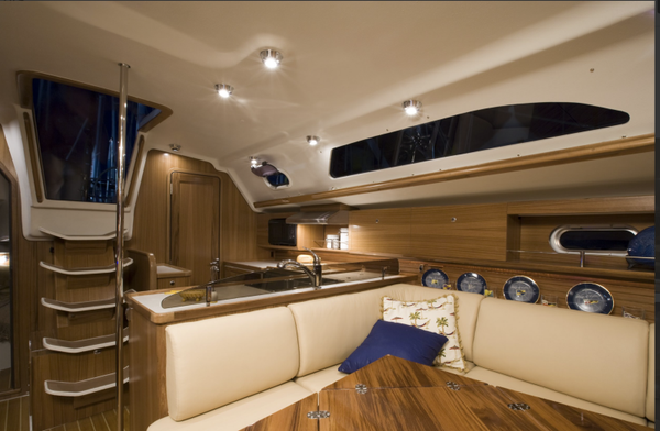 Main Saloon Features Large Dinette, Gloss Finished Dining Table to Port, Settee Seating Starboard